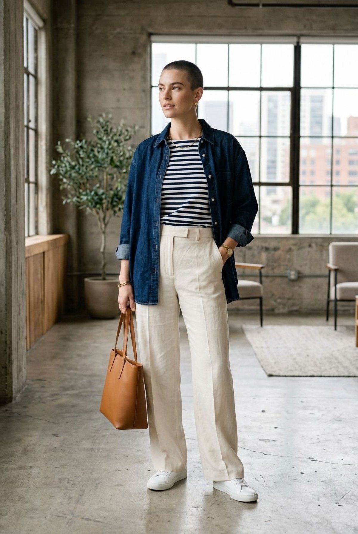 Teraz najważniejsze: bluzka w paski do czego nosić? Oto trzy niezawodne propozycje. Po pierwsze, pod granatową lub khaki suit – zestaw spodni i marynarki w tym samym kolorze. To eleganckie, a paski ożywiają całość. Po drugie, z wysokimi, szerokimi spodniami z krepy (kolor ecru lub czarny) i czarnymi butami na płaskiej podeszwie. Po trzecie, pod overalls z denimu – wystający kołnierzyk i mankiety dodadzą stylizacji warstwowości. Unikaj łączenia pasków z dżinsem w tym samym odcieniu niebieskiego – to zbyt jednolite. Zamiast tego, postaw na kontrast: jasne paski z ciemnym denimem.