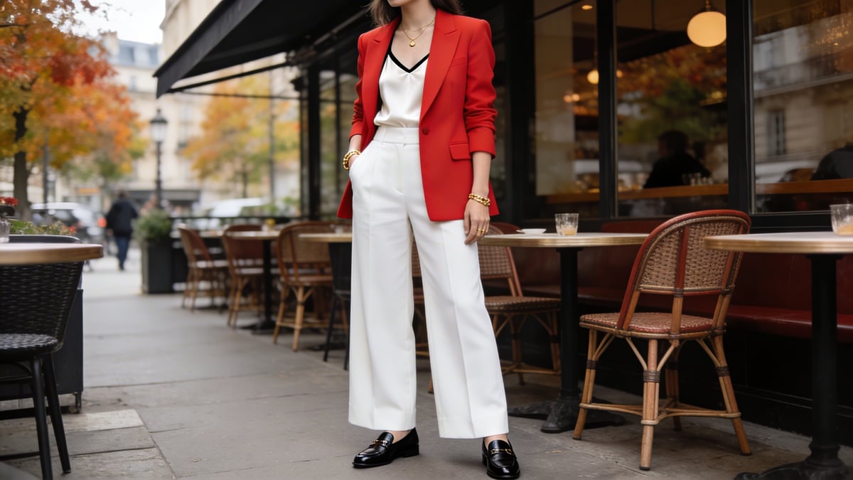 I najważniejszy trik: gra odcieni bieli. Biel nie jest jedna. Połącz ecru, kość słoniową i czysty biały. Na przykład: marynarka w intensywnej czerwieni, top w kolorze ecru, spodnie w czystej bieli, a buty w odcieniu kości słoniowej. Ta subtelna gradacja tworzy niezwykle wyrafinowany i nowoczesny efekt, który jest kwintesencją paryskiego szyku w codziennych stylizacjach. To wygląda jak coś, co wymagało godzin planowania, a w rzeczywistości jest błyskawiczne i genialnie proste.