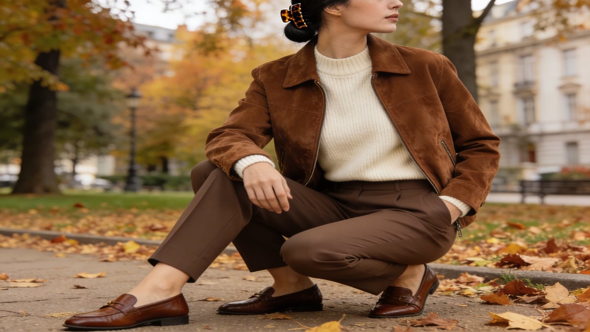 To jest poziom zaawansowany, ale gdy go opanujesz, twoje stylizacje zyskają profesjonalny szlif. Chodzi o świadome łączenie faktury twoich włosów z fakturą ubrania. Weźmy za przykład naszą bohaterkę tej jesieni – brązową zamszową kurtkę. Zamsz jest miękki, matowy i aksamitny w dotyku. Jeśli masz naturalnie gładkie, lśniące włosy, stworzysz piękny kontrast między błyszczącymi pasmami a matowym zamszem. To połączenie jest bardzo eleganckie.