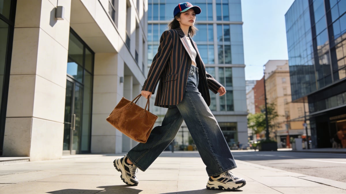 Nakładamy na to marynarkę oversize w prążki. Zapinamy? Raczej nie. Luźno zarzucona na ramiona lub rozpięta działa najlepiej, odsłaniając wysoki stan spodni. Teraz dodatki: na głowę – minimalistyczna czapka z daszkiem, na ramię – miękka, zamszowa torba tote. Na nogi – czyste, stylowe sneakersy. A co z biżuterią? Postaw na złoto – delikatny łańcuszek, małe kolczyki. Unikaj dużych, kolorowych korali, które będą konkurować z prążkami marynarki.
