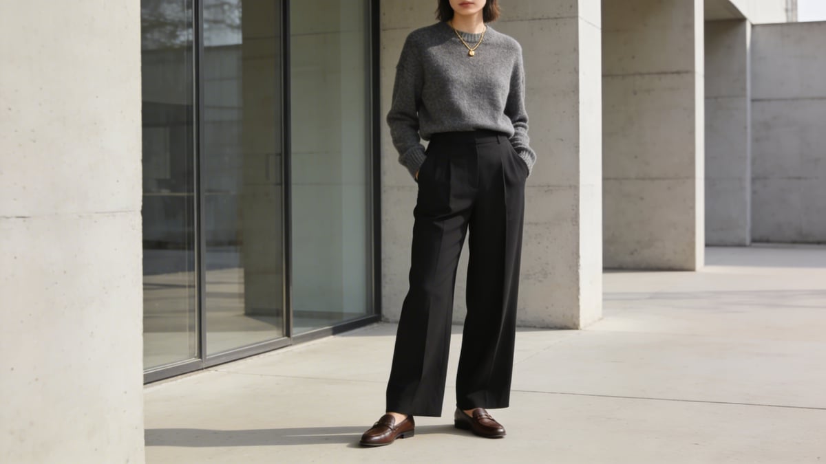 W minimalizmie dodatki są jak interpunkcja – nadają ton całej wypowiedzi. Zestaw szary sweter + czarne spodnie to neutralne tło, na którym możesz grać. Buty to najważniejszy wybór. Oto jak zmieniają charakter stylizacji: