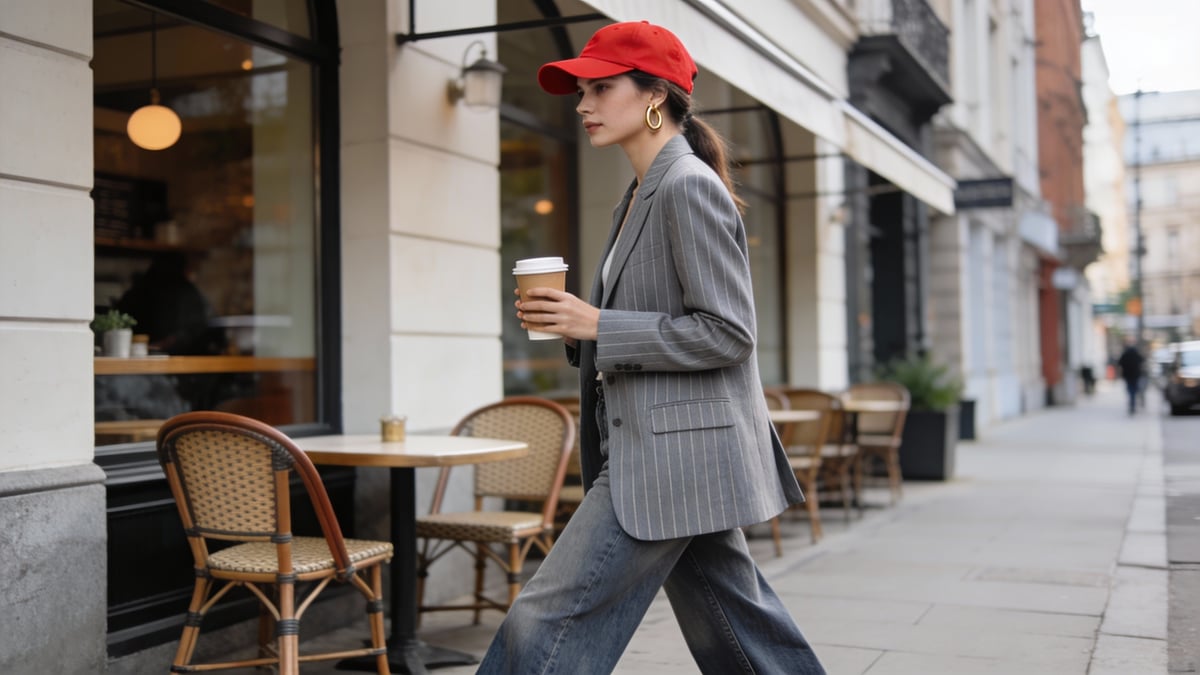Dziś pokażemy ci, jak mistrzowsko wkomponować ten żywiołowy akcent w swobodną, miejską stylizację. Punktem wyjścia jest genialne połączenie dwóch pozornie sprzecznych elementów: eleganckiej, szarej marynarki w prążki i zupełnie casualowej, czerwonej czapki z daszkiem. To przepis na idealny look na kawę w mieście, spotkanie z przyjaciółmi czy weekendowy spacer. W tym artykule rozłożymy tę stylizację na czynniki pierwsze. Dowiesz się, jak wybrać idealną marynarkę, połączyć ją z szerokimi jeansami, dobrać pozostałe dodatki (takie jak modne złote kolczyki) i uniknąć podstawowych błędów. Gotowa na zastrzyk modowej energii? Zaczynamy!