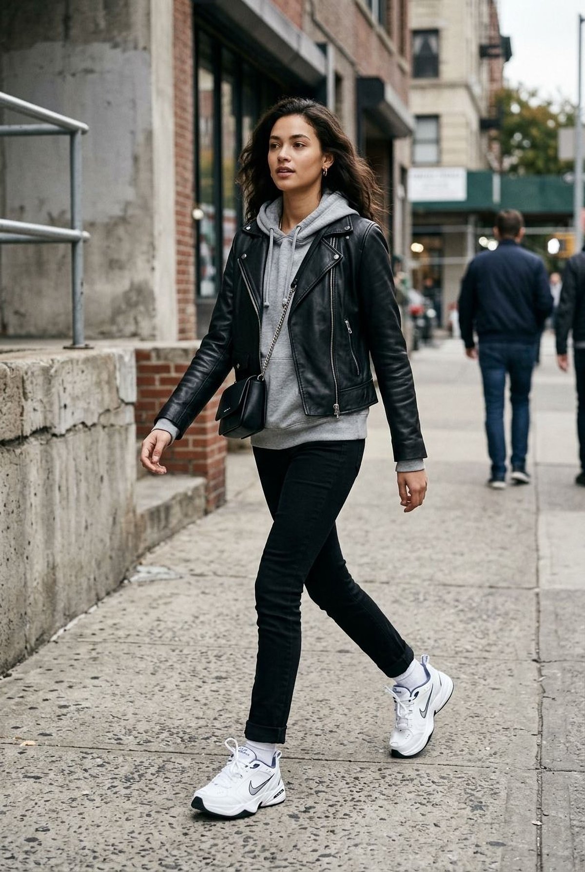 Czarna skórzana kurtka – najlepsza przyjaciółka sneakersów